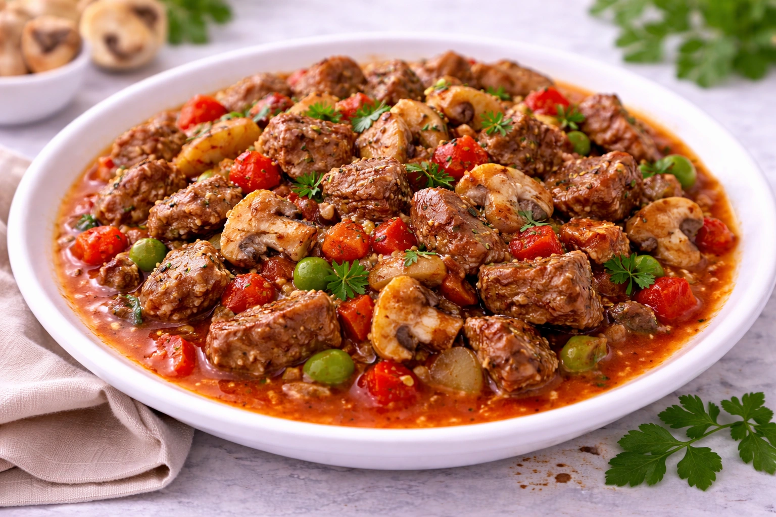 KRD Catering Damak Şefi’nin mutfağında hazırlanan mantarlı et sote, özenle seçilen dana eti ve taze mantarların uyumuyla geleneksel tariflere sadık kalınarak üretilir. Sebzeler ve özel sos ile zenginleştirilen bu lezzet, sulu yapısı ve dengeli baharat aromasıyla öne çıkar.